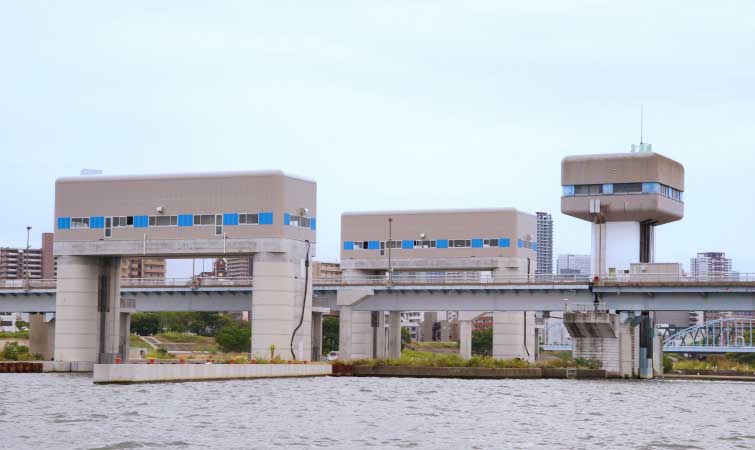 高潮に備えて防潮水門を閉鎖すると、大川(旧淀川)の水位が上がり、浸水氾濫が起こる可能性があります。
