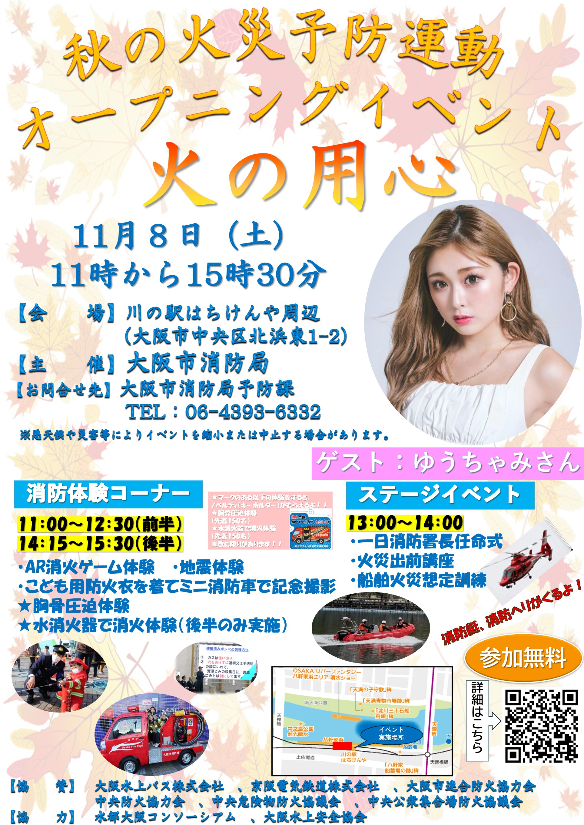 モデルでタレントの「ゆうちゃみさん」をゲストに迎え、1日消防所長任命式やステージイベントを実施するほか、AR消火ゲームによる消火体験や起震車による地震体験、ミニ消防車との記念撮影などの消防体験コーナーが行われます。